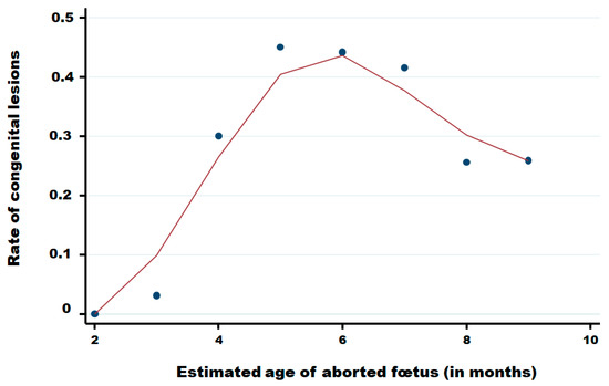 Rate of congenital lesions in aborted foetuses in function of the month of pregnancy of cattle. Legend: Points are observed data; the red solid line was obtained using the Lowess smoothing method [22].