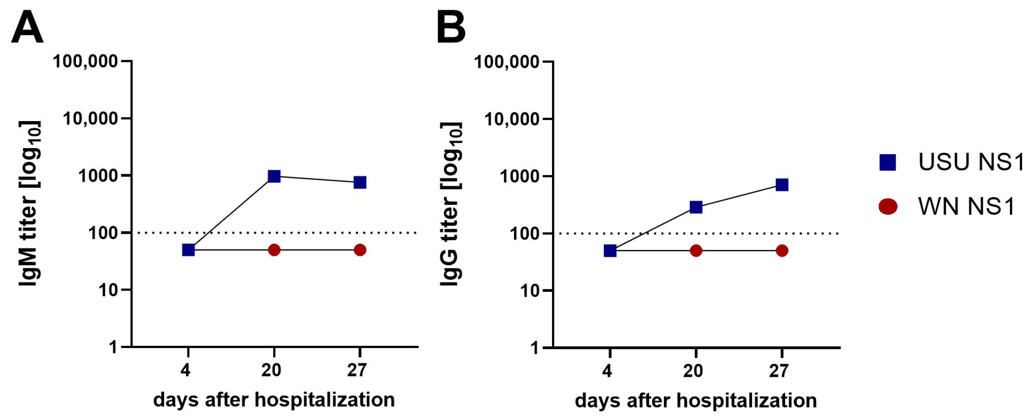 3.2. Detection of NS1 IgM and IgG Antibodies in Serum Samples of WN and USU Cases