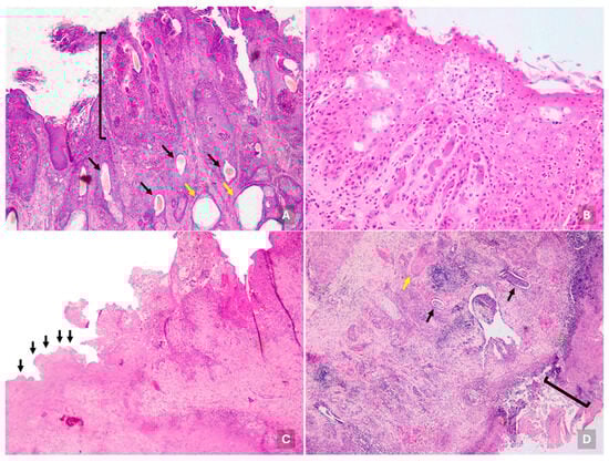 At the esophagus, lesions were observed in 36.21% of cases (21/58), affecting the entire wall in a focally diffuse pattern. These lesions included erosions with partial mucosal loss and necrotic debris (33.33%; 7/21), and ulcers with complete epithelial detachment and lamina propria involvement (66.67%; 14/21). In most cases (80.95%; 17/21), these lesions were accompanied by submucosal esophagitis, characterized by infiltration of lymphocytes, macrophages, plasma cells, and neutrophils (Figure 2C). Additionally, hemorrhages were occasionally observed in the submucosa (14.29%; 3/21) and serosa (4.76%; 1/21).