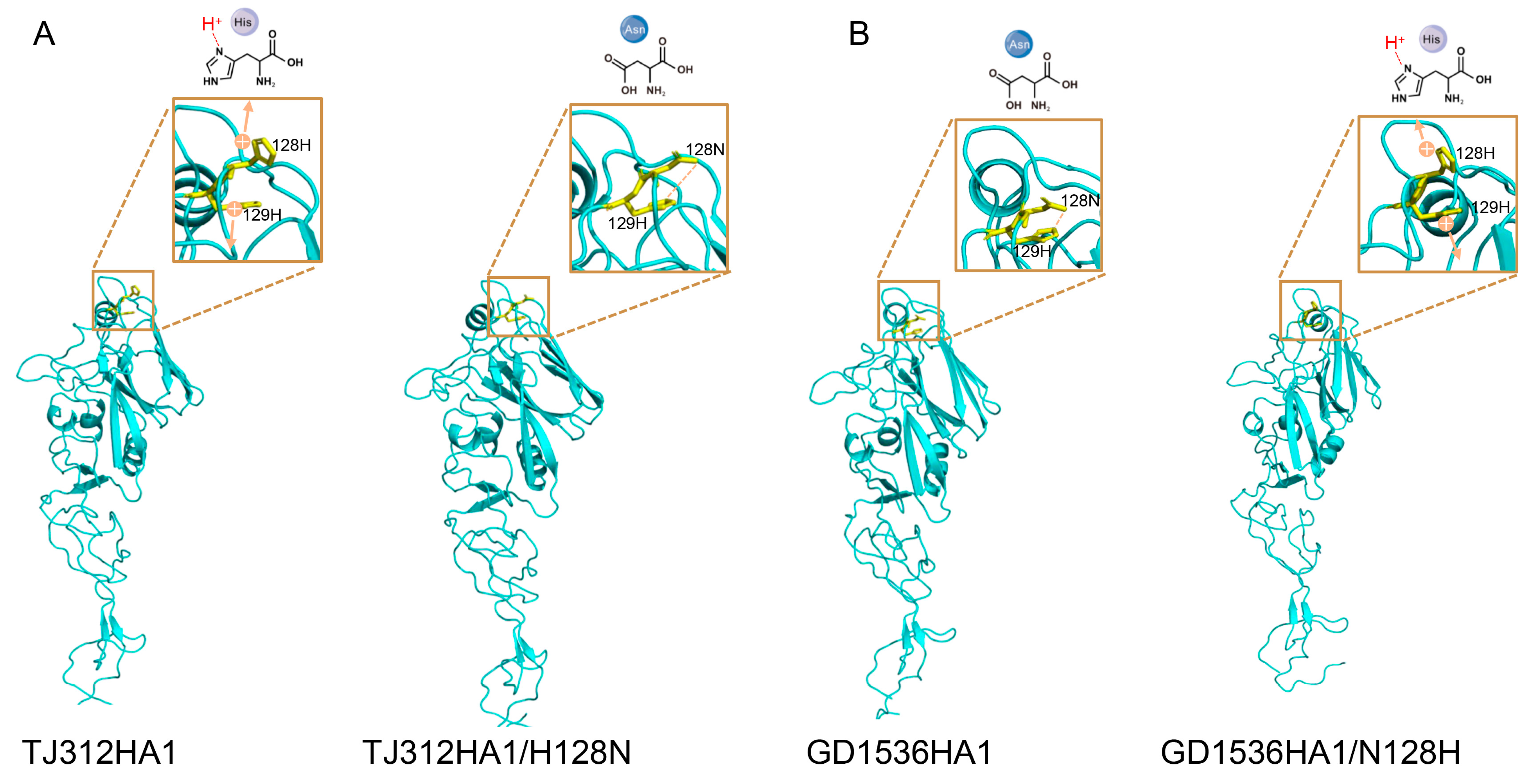 3.4. Structural Analysis Reveals the Impact of the 128 Amino Acid Substitution on HA1 Conformation