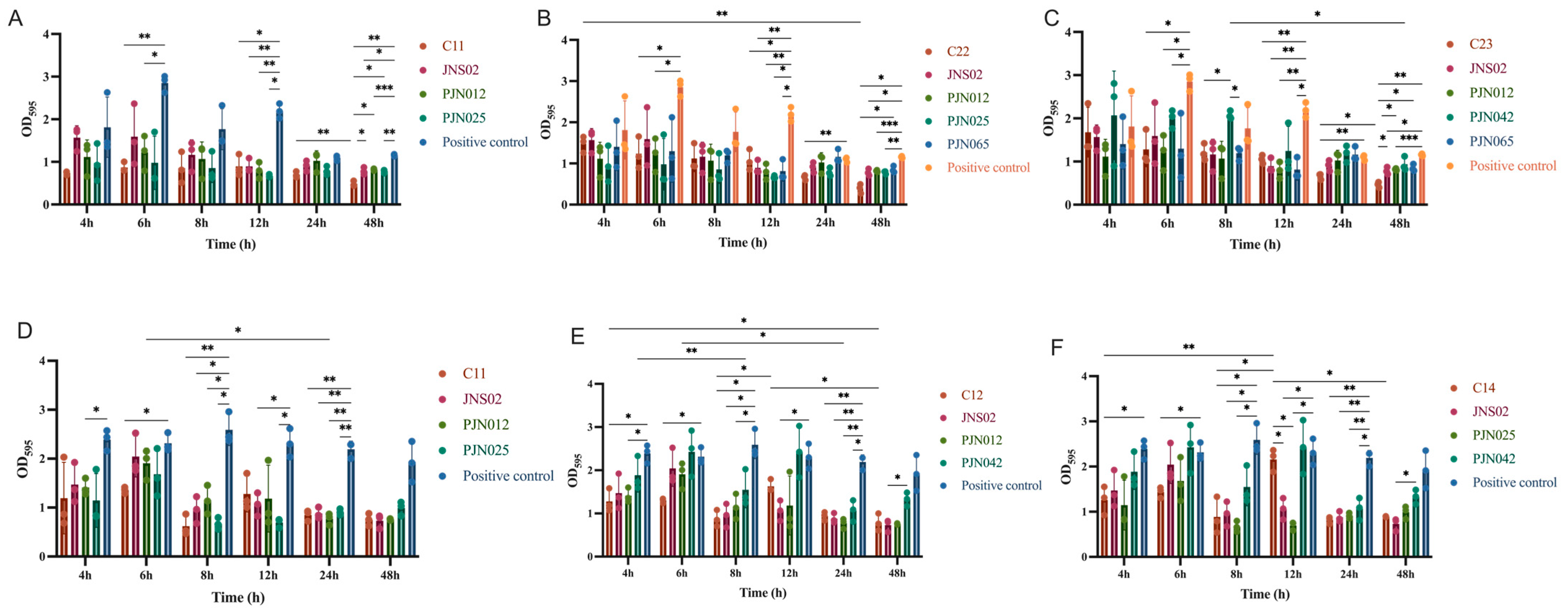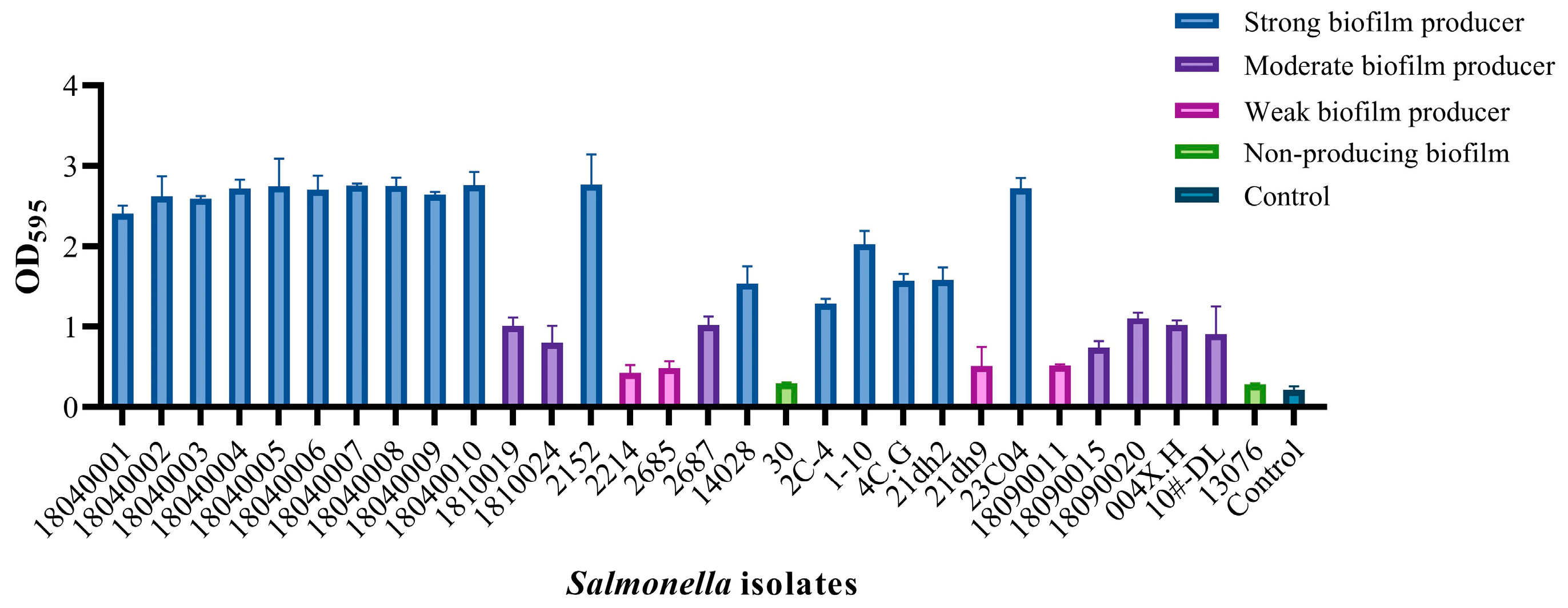 3.1. Host Bacterial Characterization and Selection of Biofilm-Forming Strains