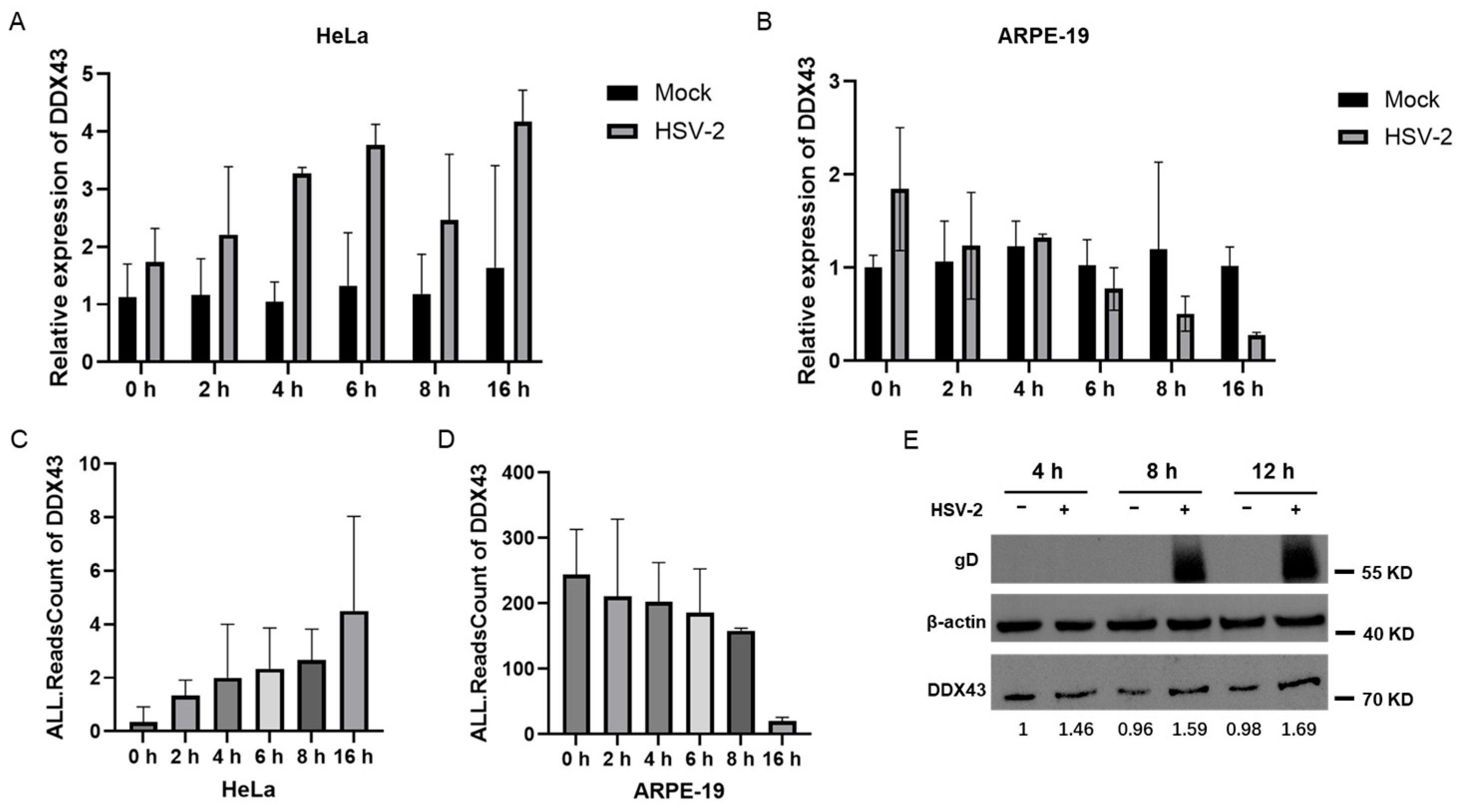 Cheng, R.; Li, Y.; Chen, Y.; Zhang, M.; Hu, Q.; Liu, Y. Comparative Transcriptomics Analyses Identify DDX43 as a Cellular Regulator Involved in Suppressing HSV-2 Replication. Viruses 2025, 17, 1366. https://doi.org/10.3390/v17101366