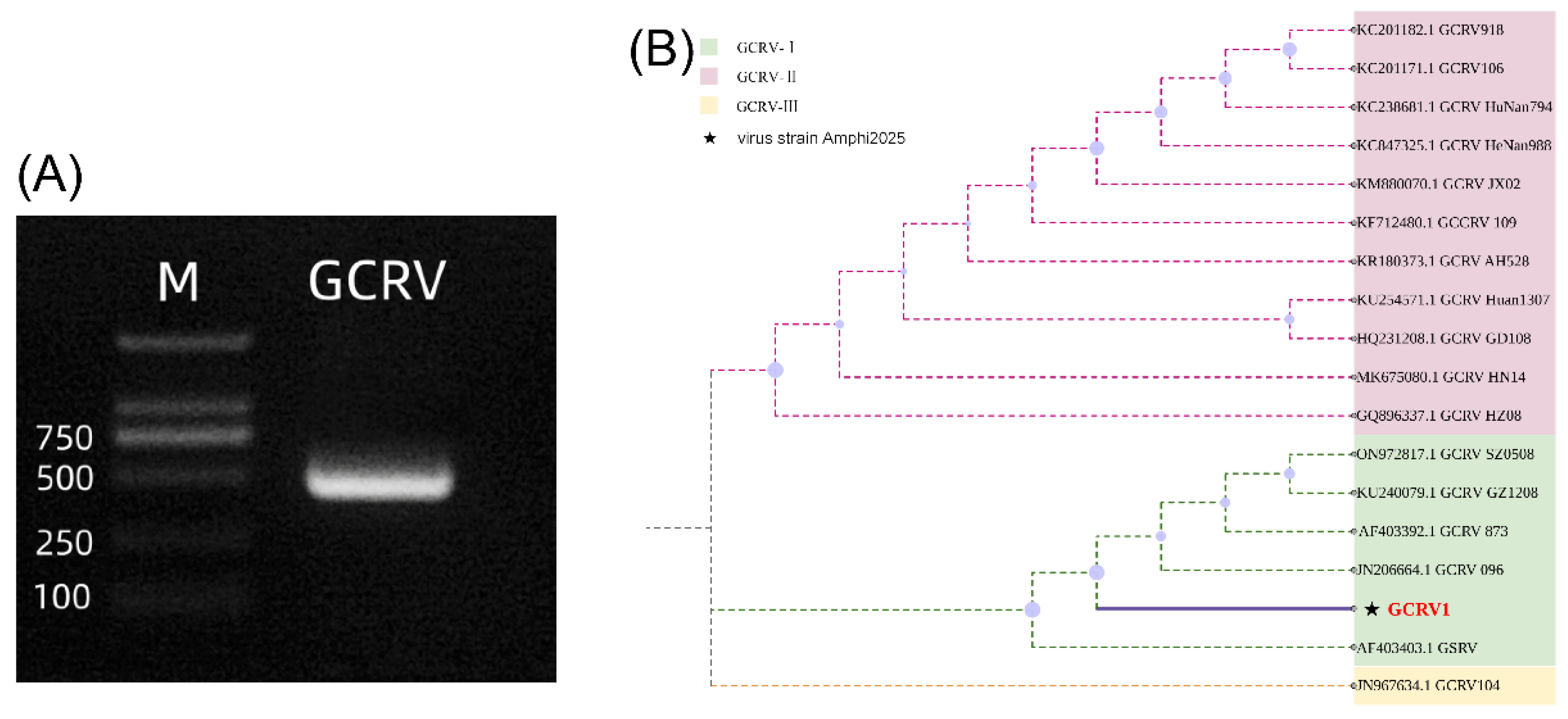 Lin, J.; Yang, M.; Yang, H.; Ji, G.; Liu, Z. First Investigation of Grass Carp Reovirus (GCRV) Infection in Amphioxus: Insights into Pathological Effects, Transmission, and Transcriptomic Responses. Viruses 2025, 17, 1367. https://doi.org/10.3390/v17101367