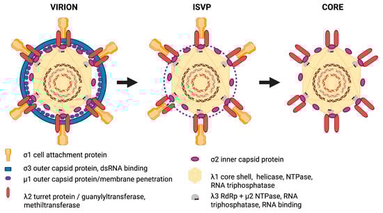 Viral entry likely initiates through the interaction of σ1 with an unidentified receptor, followed by endocytosis (Figure 2). Within endosomes, acidification triggers partial disassembly: host proteases remove σ3 [], exposing μ1, which is then cleaved into various processed forms [,]. Amino acid analysis has shown that PRV retains the conserved cleavage sites of μ1 found in MRV, which split it into μ1N and μ1C. Subsequently, μ1C is further cleaved into the fragments µ1δ and µ1φ (Figure 1) []. These events result in the production of the infectious subviral particle (ISVP). This process stimulates the release from the endosome, allowing the remaining parts of μ1 and presumably σ1 to be liberated, ultimately releasing the core particle into the cytoplasm.