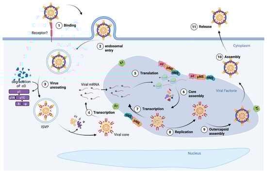 Proposed replication cycle of Piscine orthoreovirus (PRV) in host cells. The replication cycle of PRV is illustrated as a stepwise model based on structural transitions and functional analogies with Mammalian orthoreoviruses. (1) Infection is initiated by the binding of the σ1 protein to an unknown cellular receptor. (2) The virion enters the cell through receptor-mediated endocytosis. (3) Within the acidified endosome, host proteases degrade the σ3 outer capsid protein, generating the infectious subviral particle (ISVP) and exposing the μ1 protein, which is subsequently cleaved into μ1N and μ1C, and further into δ and φ fragments. (4) Membrane penetration by μ1 enables cytoplasmic release of the transcriptionally active viral core, which contains λ1, λ2, λ3, and μ2 proteins. Transcription of the viral genome occurs within the core, and capped, non-polyadenylated mRNAs are extruded through the λ2 turret. (5) Viral mRNAs are translated in the cytoplasm, producing structural and non-structural proteins, including μNS and σNS. (6) These proteins are recruited to viral factories, cytoplasmic compartments where (7) secondary transcription occurs and (8) genome replication takes place. (9) Nascent cores are assembled and encapsidated with newly synthesized dsRNA segments, followed by (10) assembly of the outer capsid components. (11) Mature virions are released into the cytoplasm. The cytotoxic non-fusogenic protein p13 localizes to the cytoplasmic membrane but does not participate in fusion. The precise mechanism of viral egress remains unknown. Created in BioRender. Rivas, A. (2025) https://BioRender.com/665jm7m. Accessed on 19 August 2025.