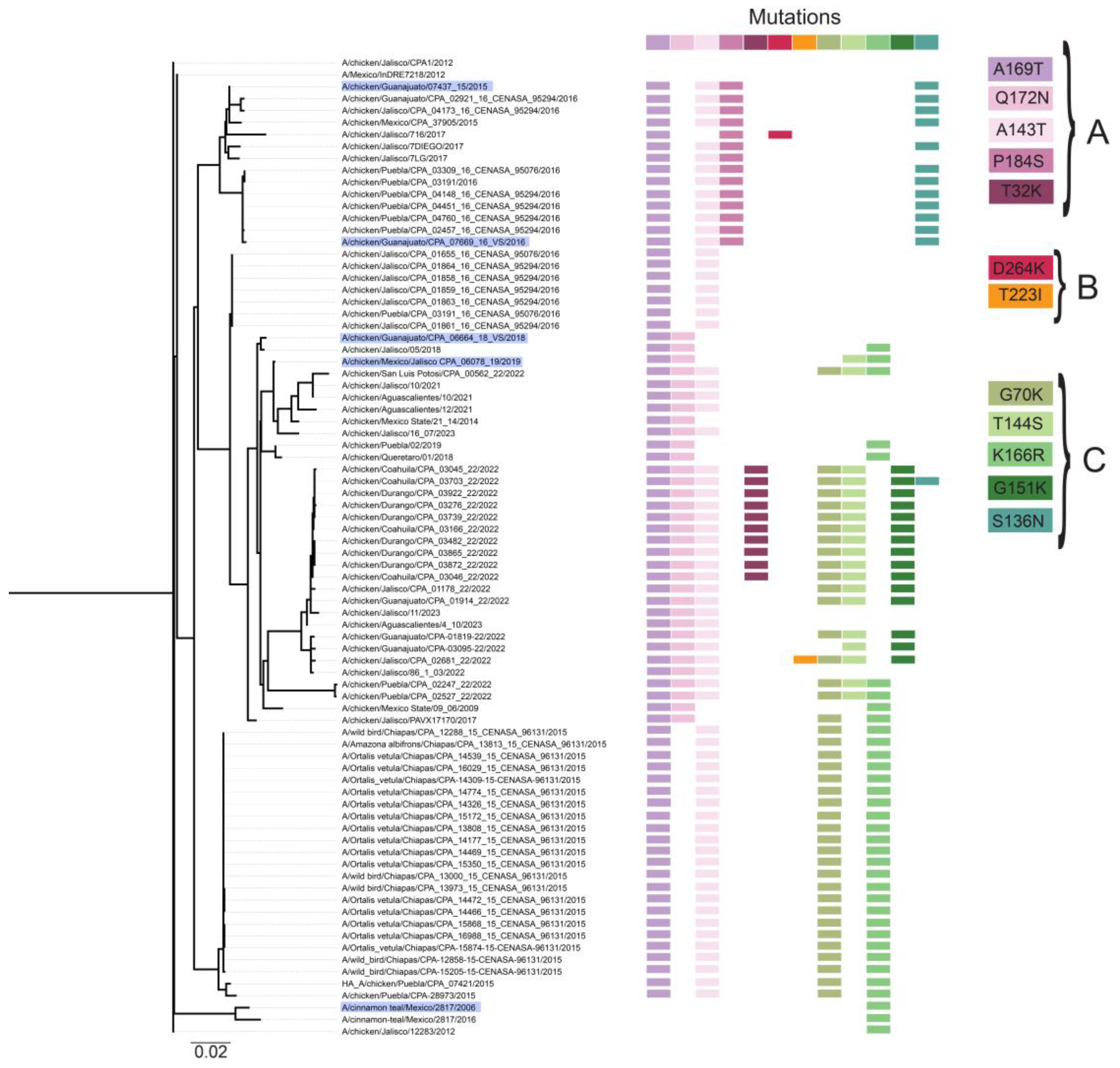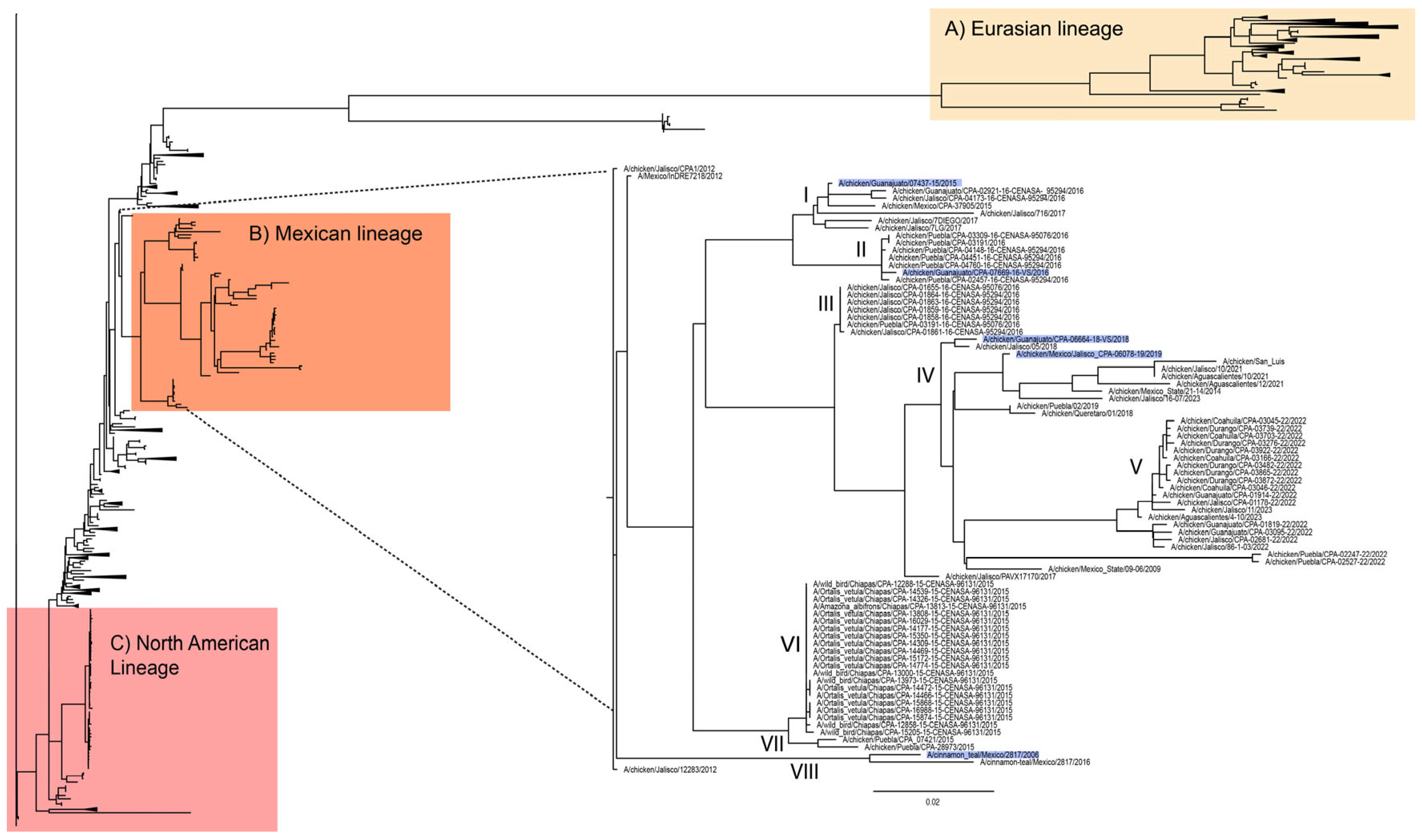 - Navarro-Lopez, R.; Xu, W.; Gomez-Romero, N.; Velazquez-Salinas, L.; Berhane, Y. Phylogenetic Inference of the 2022 Highly Pathogenic H7N3 Avian Influenza Outbreak in Northern Mexico. Pathogens 2022, 11, 1284. [Google Scholar] [CrossRef]