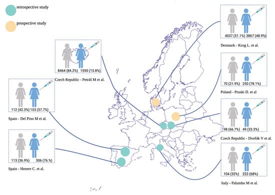 These 7 publications examined the impact of the 9-valent vaccine in patients with HPV infection or precancerous cervical lesions, involving a total of 19,414 individuals. Among them, 6437 (33.2%) were vaccinated, while 66.8% (12,977/19,414) were unvaccinated. Two studies were prospective (Krog L. et al. [] and Pruski D. et al. []), with the rest being retrospective analyses. Dvořák V. [], Palumbo M. [], Petráš M. et al. [], Del Pino M. [] and Henere C. [] focused on whether HPV vaccination could lower the risk of recurrence following cervical excision forHSIL. One study, conducted by Pruski D. et al. [], aimed to evaluate HPV resolution post-immunization in initially positive patients. Finally, Krog L. [], along with their co-authors, investigated whether women vaccinated against HPV and under active surveillance for CIN2 were less likely to progress to CIN3 or worse compared to unvaccinated women.