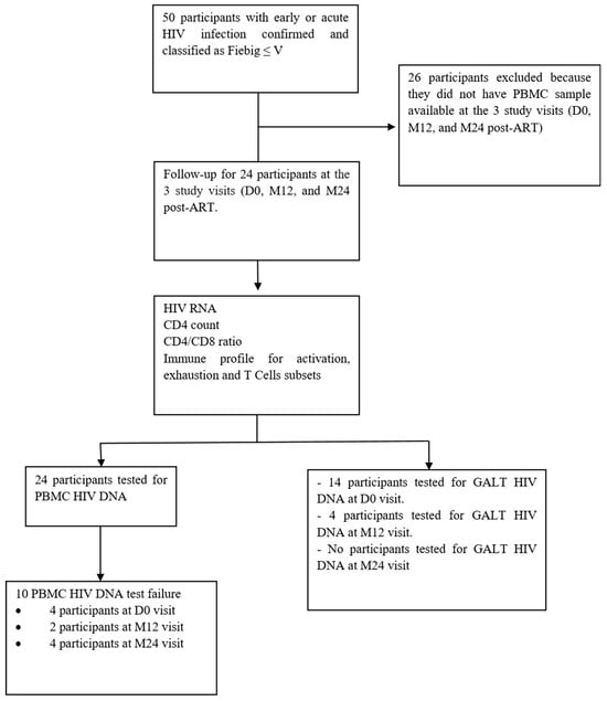 Flowchart of the study. D0: Day 0 or pre-ART visit; M12: month 12; M24: month 24; GALT: gut-associated lymphoid tissue; PBMC: peripheral blood mononuclear cells.