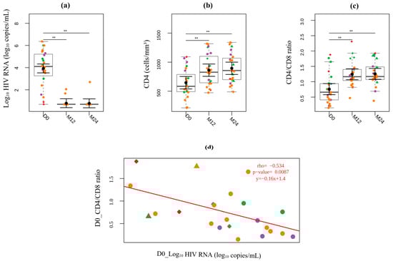 Longitudinal analysis of viral load and T cell count. (a) HIV viral load, (b) CD4 T Cell Count, and (c) CD4/CD8 Ratio at D0, M12, and M24. Fiebig stages are identified by colors as follows: red (I), blue (II), green (III), purple (IV), and orange (V). Participants who began ART prescribed as post-exposure prophylaxis (PEP) before the diagnosis are represented by the diamond symbol, while those identified while seeking pre-exposure prophylaxis (PrEP) at the time of diagnosis are represented by triangle symbols. For black error bars, central dots represent mean marginal estimates and parallel lines indicate the upper and lower 95% confidence interval limits. Gray boxplots represent the boxplot of the sampled distribution. (d) Correlation analysis of CD4/CD8 ratio and HIV RNA at D0. p-values were generated from mixed linear regression analysis and correlations were analyzed using Pearson’s correlation test. ** indicates p < 0.01.