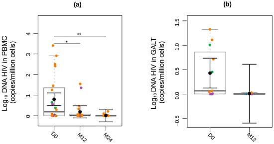 Longitudinal analysis (a) Peripheral Blood Mononuclear Cells (PBMCs) and (b) Gut-Associated Lymphoid Tissue (GALT) harboring total HIV DNA at D0, M12, and M24 Fiebig stages are identified by colors as follows: red (I), blue (II), green (III), purple (IV), and orange (V). Participants who began ART prescribed as post-exposure prophylaxis (PEP) before the diagnosis are represented by the diamond symbol, while those identified while seeking pre-exposure prophylaxis (PrEP) at the time of diagnosis are represented by triangle symbols. For black error bars, central dots represent mean marginal estimates and parallel lines indicate the upper and lower 95% confidence interval limits. Gray boxplots represent the boxplot of the sampled distribution. The p-values were generated from mixed linear regression analysis. * indicates p < 0.05; ** indicates p < 0.01.