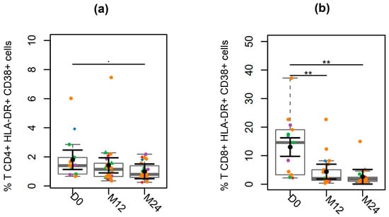 The reduction in the frequency of the activated CD8+ T cell after initiating treatment was more pronounced, with significant decreases observed at M12 and M24 compared to D0 (p < 0.001 for both) (Figure 4b). This trend was also evident in the two participants mentioned earlier, whose activation profiles were substantially below the mean (2.4% and 2.2%, compared to the group mean of 13%). Additionally, we observed a strong positive correlation between the frequency of activated T cells at D0 and the level of the viral reservoir at M24 (CD4+: rho = 0.77; p = 0.006; CD8+: r = 0.68; p = 0.02). Furthermore, there was a significant positive correlation between the level of T cell activation at M12 and the viral reservoir at M12 (CD4+: rho = 0.73; p = 0.0003; CD8+: rho = 0.45; p = 0.04) and M24 (CD4+: rho = 0.80; p < 0.0001; CD8: r = 0.64; p = 0.004). These correlations were not observed in GALT (Supplementary Figure S3).