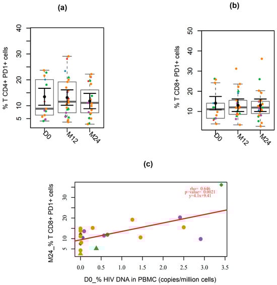 Longitudinal analysis of T cell exhaustion. (a) CD4+ PD-1+ T cells and (b) CD8+ PD-1+ T cells. (c) Correlation between expression of PD-1 at M24 and HIV reservoir in PBMC at baseline. Fiebig stages are identified by colors as follows: red (I), blue (II), green (III), purple (IV), and orange (V). Participants who began ART prescribed as post-exposure prophylaxis (PEP) before the diagnosis are represented by the diamond symbol, while those identified while seeking pre-exposure prophylaxis (PrEP) at the time of diagnosis are represented by triangle symbols. For black error bars, central dots represent mean marginal estimates and parallel lines indicate the upper and lower 95% confidence interval limits. Gray boxplots represent the boxplot of the sampled distribution. p-values were generated from mixed linear regression analysis and correlations were analyzed using Pearson’s correlation test.