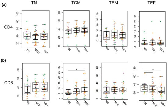 Longitudinal Analysis of the T cell substes. (a) CD4+ and (b) CD8+ T cell subsets. TN: Naive T cells, TCM: Central Memory T cells, TEM: Effector Memory T cells and TEF: Effector T cells. Fiebig stages are identified by colors as follows: red (I), blue (II), green (III), purple (IV), and orange (V). Participants who began ART prescribed as post-exposure prophylaxis (PEP) before the diagnosis are represented by the diamond symbol, while those identified while seeking pre-exposure prophylaxis (PrEP) at the time of diagnosis are represented by triangle symbols. For black error bars, central dots represent mean marginal estimates and parallel lines indicate the upper and lower 95% confidence interval limits. Gray boxplots represent the boxplot of the sampled distribution. p-values were derived from mixed linear regression analysis. * indicates p < 0.05; ** indicates p < 0.01.