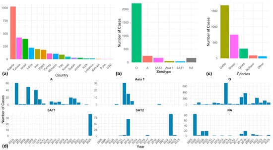 Graphical summary profile of the Foot-and-Mouth Disease outbreaks in the Middle East and Northern Africa between 2005 and 2025. (a) Frequency of the outbreaks per country. (b) Frequency of each serotype. (c) Frequency of the outbreaks per host species. (d) Temporal distribution of the outbreaks for each serotype.