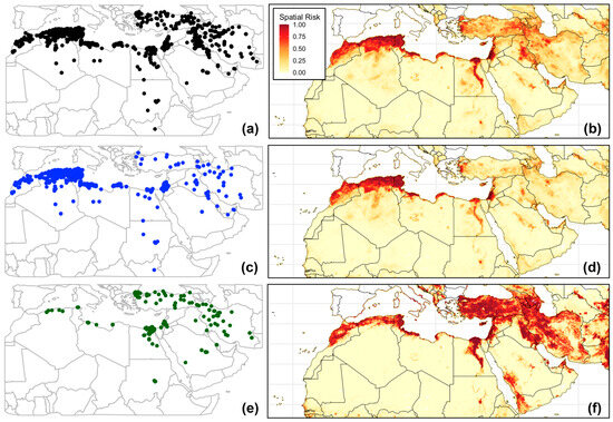 Locations of Foot-and-Mouth Disease (FMD) outbreaks reported in Middle East and Northern Africa between 2005 and 2025. (a) Geographical distribution of all FMD outbreaks. (b) Predicted spatial risk (p) of all outbreaks using extreme gradient boosting algorithm. p ≥ 0.75 indicates high risk, 0.75 < p ≤ 0.25 moderate risk, and p < 0.25 indicates low risk areas (c) Geographical distribution of serotype O outbreaks. (d) Predicted spatial risk of serotype O outbreaks using random forest algorithm. (e) Geographical distribution of serotype A outbreaks. (f) Predicted spatial risk of serotype A outbreaks using the random forest algorithm.