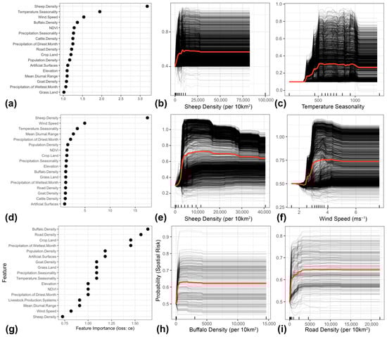 Feature importance plots rank ordering risk factors that contribute to Foot-and-Mouth Disease (FMD) spatial risk in the Middle East (a,d,g). Relative importance was estimated using a classification error loss function (loss: ce). (b,c,e,f,h,i) Illustrate centered individual conditional expectation (ICE) plots for the top two important features that contribute to the risk of FMD. The black lines represent the predicted risk of a FMD outbreak in a specific geographical location, while the red line signifies the partial dependence, calculated as the average risk across all locations. (a–c) Indicate all FMD outbreaks. (d–f) Indicate serotype O. (g–i) Indicate serotype A. Temperature seasonality had no specific unit and calculated as the standard deviation of monthly temperatures (°C) scaled by 100.