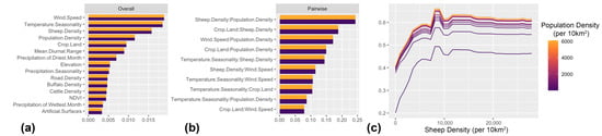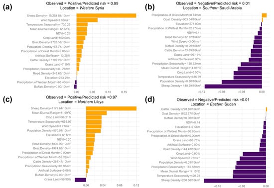 Our ML statistical framework inferred sheep density followed by temperature seasonality as the most important features associated with the predicted spatial risk of all FMD outbreaks in the MENA region (Figure 3a). Temperature seasonality is derived from the standard deviation of monthly mean temperature multiplied by 100. Low values of temperature seasonality represent relatively constant temperatures throughout the year (e.g., at the equator) and high values represent large intra-annual variation in temperatures (e.g., continental climates with hot summers and cold winters). PD plots showed that the spatial risk of all FMD outbreaks showed increased FMD risk even at very low sheep density, but this risk plateaued at values > 500 sheep per 5 km2 (Figure 3b). Also, PD plots illustrated that the risk of all FMD outbreaks sharply increased and plateaued when temperature seasonality was at values ≅ 500 (Figure 3c). Wind speed followed by temperature seasonality had the strongest overall interactions with other features (Figure 4a). However, the interaction between sheep density and human population density was the strongest among all other 2-way interactions that shape the risk of all FMD outbreaks (Figure 4b). Our model showed that the spatial risk was the highest when sheep and human densities were >500 animals and >6000 humans per 10 km2, respectively (Figure 4c). In addition, Shapley values (Figure 5a) showed that the randomly chosen site in Western Syria suggested a probable FMD outbreak was likely observed there, due to high sheep density (>15,000 animals per 10 km2) and wind speeds averaging over 3.3 ms−1. Conversely, the site that we selected in southern Saudi Arabia was likely negative (i.e., no outbreak recorded) due to substantially small densities of sheep and human densities (<141 animals per 10 km2 and <2 per 10 km2, respectively; Figure 5b).