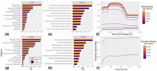 Freidman’s H-statistic feature interaction plots between features that shape the spatial risk of Foot-and-Mouth Disease (FMD) in the Middle East and Northern Africa. (a–c) all FMD outbreaks. (d–f) Serotype O outbreaks. (g–i) Serotype A outbreaks. (a,d,g) Showing overall interaction strength per feature. (b,e,h) Showing the strongest pairwise interactions between features. (c,f,i) Partial dependence plots for the top individual pairwise interaction between features corresponding to the figure on the left.