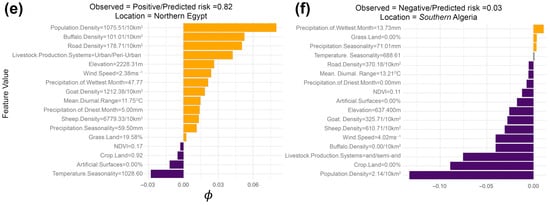 Shapley plots showing feature contributions for each Foot-and-Mouth Disease (FMD) outbreak reported in six randomly selected geographical locations across the Middle East and Northern Africa. Features’ magnitude of contribution was inferred using Shapley values (). Positive ϕ values indicate that this feature increased the risk of a given FMD outbreak. Negative ϕ values indicate that this feature decreased the risk of a given FMD outbreak. (a,b) All FMD serotypes. (c,d) Serotype O. (e,f) Serotype A. (a,c,e) Represent positive sites. (b,d,f) Represent negative sites.