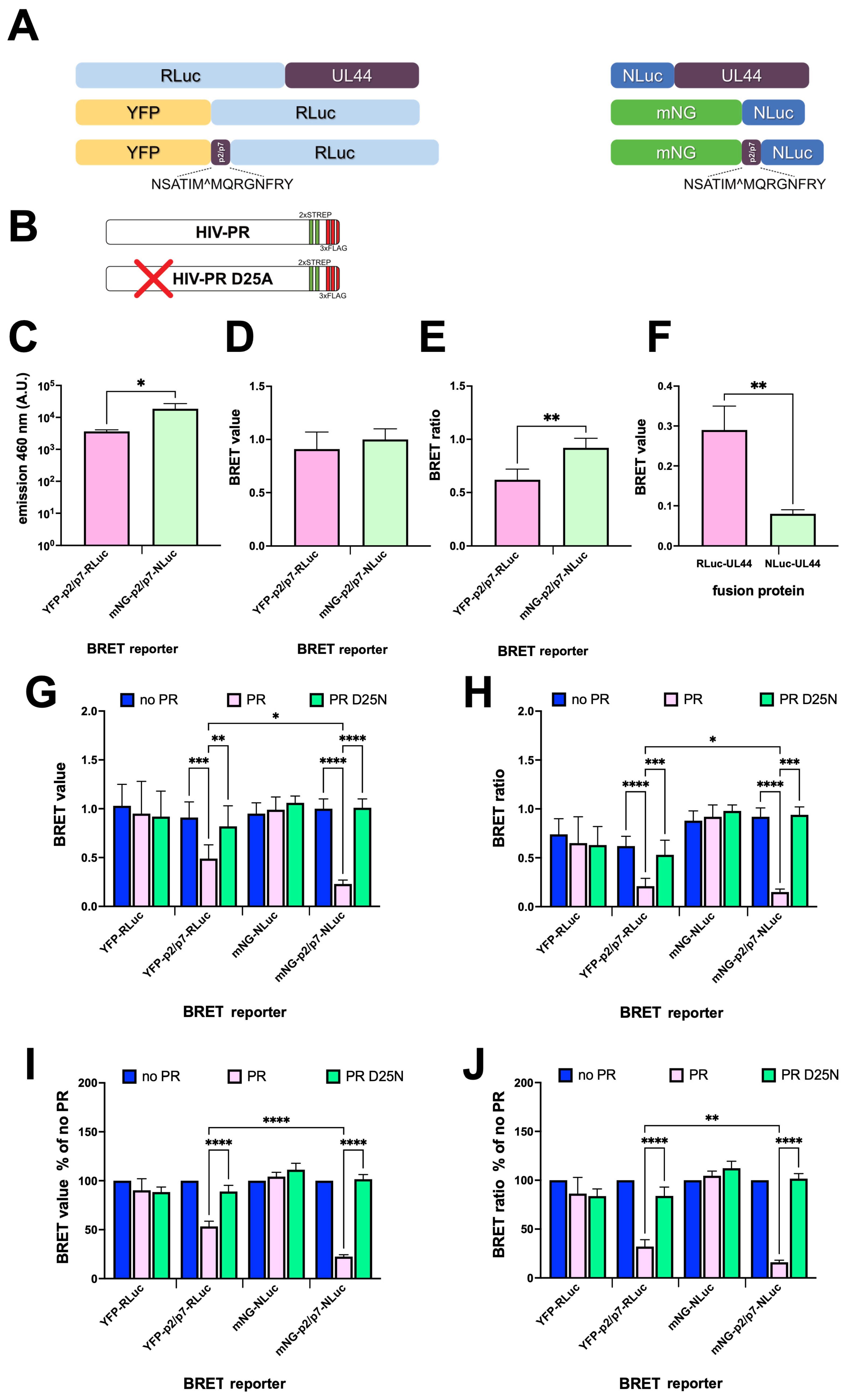 Figure 2. Development of HIV-1 PR BRET cellular reporters. HEK293T cells were seeded in a twenty-four-well plate and transfected to express the indicated fusion proteins alone (A) or in combination with either HIV-1 PR or its catalytically inactive derivative (B). Twenty-four hours p.t., cells were transferred to 96-well plates and subjected to BRET assays as described under the Materials and Methods section. The donor emission (C), the BRET value (D), and the BRET ratio (E) relative to YFP-p2/p7-RLuc and mNG-p2/p7-NLuc when expressed in the absence of HIV-1 PR are shown, along with the BRET values relative to RLuc-UL44 and NLuc-UL44 (F). (GJ) BRET values (G,I) and BRET ratios (H,J) calculated for the indicated reporter proteins expressed in the absence of HIV-1 PR (no PR, blue columns) or in the presence of either wild-type HIV-1 PR (PR, pink columns) or its catalytically inactive derivative bearing the D25N substitution (D25N, sea-green columns) are shown as raw values (G,H) or as percentages relative to the corresponding values measured in the absence of HIV-1 PR (I,J). All data shown are mean ± standard deviation of the mean relative bioluminescent signals acquired 15 min after addition of h-CTZ, from three independent experiments performed in triplicate, along with results of the Welch t-test for statistical significance. *: p < 0.05; **: p < 0.01; ***: p < 0.001; ****: p < 0.0001.