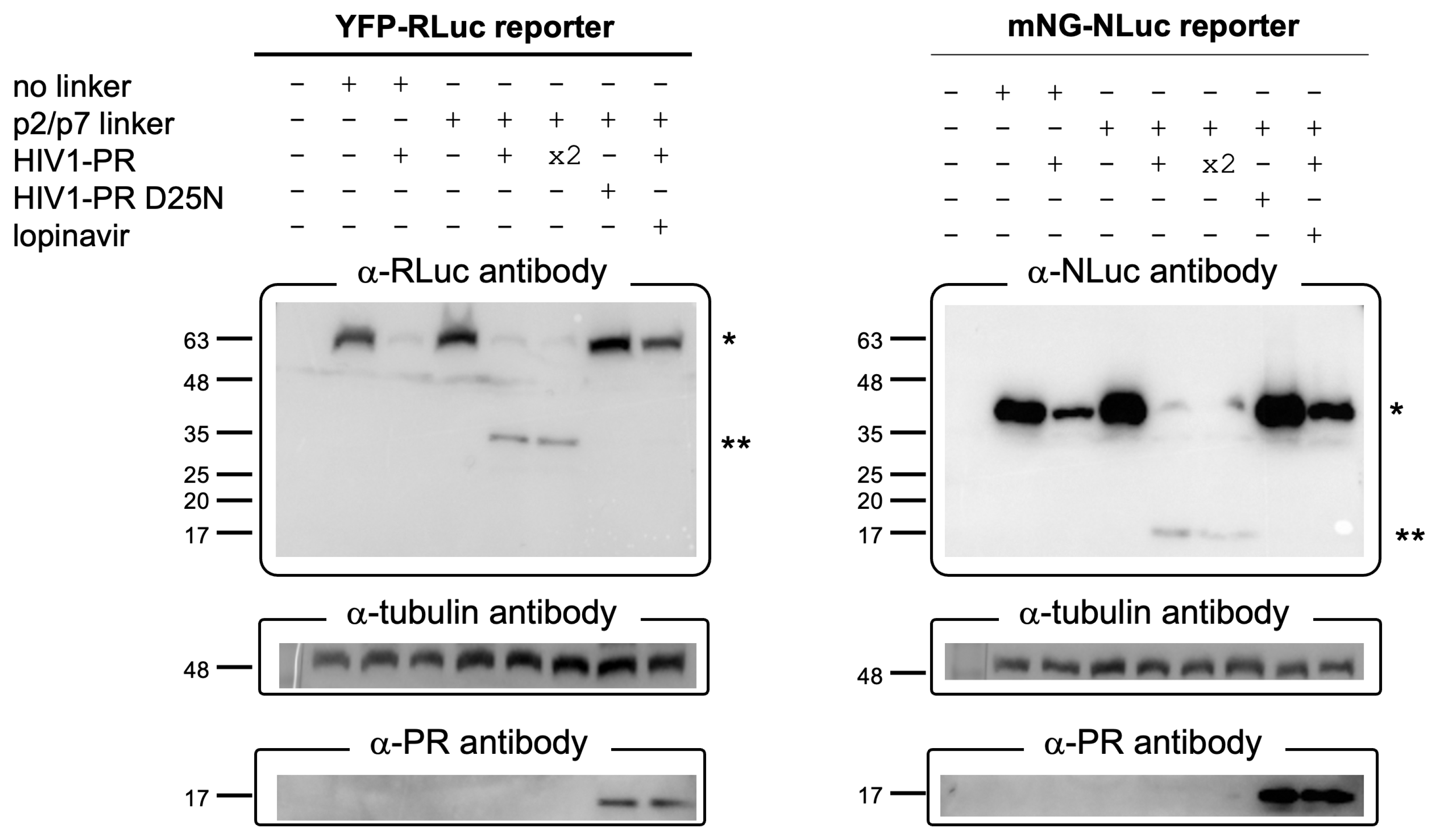 Figure 4. Validation of cleavage of BRET reporters by HIV-1 PR. HEK293T cells were seeded in 6-well plates. The day after, cells were transfected to express the indicated reporters either in the absence (−) or in the presence (+) of equal amounts of plasmids mediating the expression of HIV-1 PR or its catalytically inactive derivative D25N. Alternatively, cells were transfected with a double amount (×2) of the HIV-1 PR expressing plasmid. Six hours later, transfection reactions were removed and replaced with either complete medium or complete medium containing LOP (10 µM). Twenty-four hours p.t., cells were lysed and cell lysates used for SDS-PAGE Western blotting analysis followed by incubation of the indicated antibodies. * = uncleaved reporter; ** = cleaved reporter.