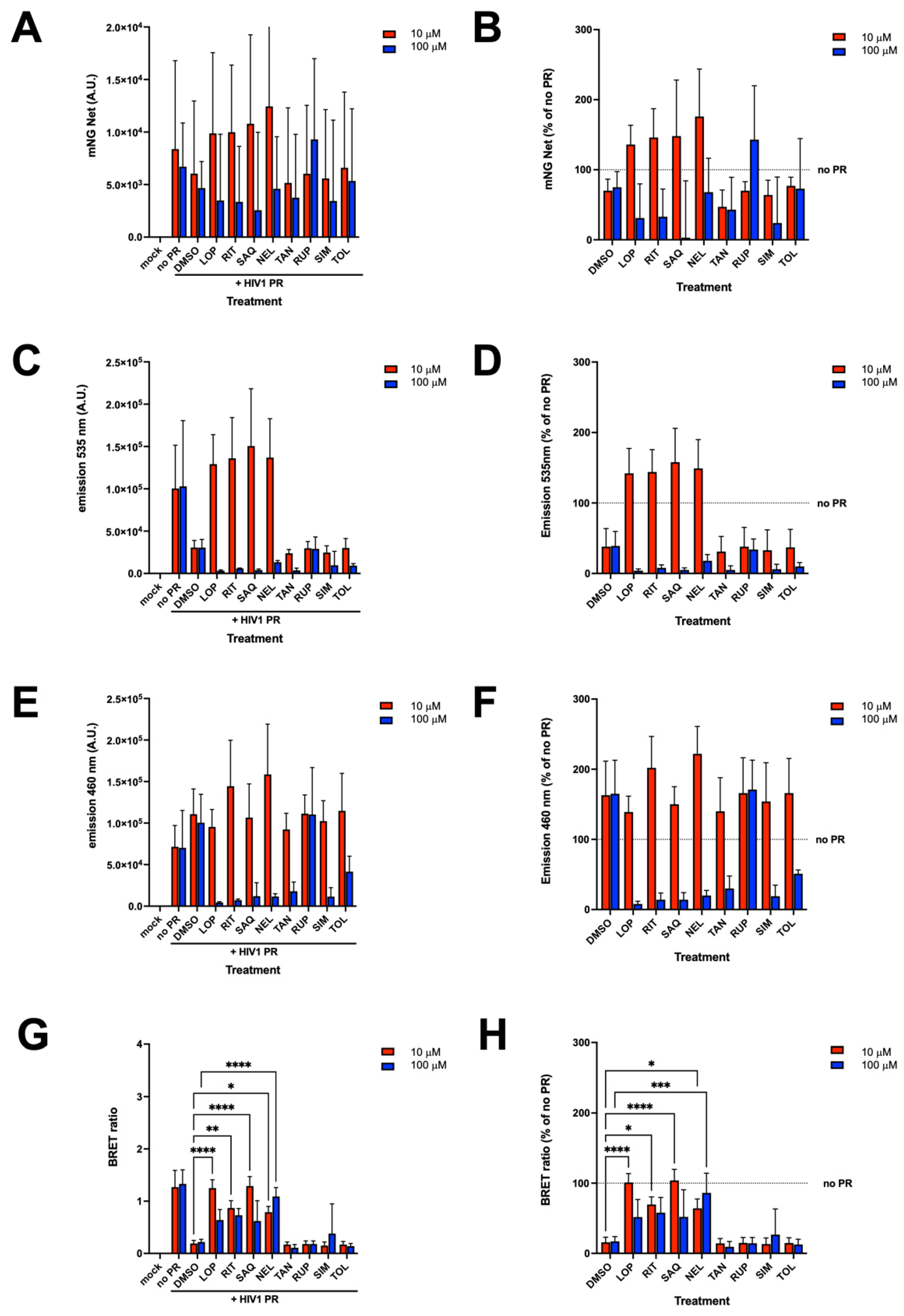 We next investigated whether the BRET reporter we developed in this study could be applied to screen compounds able to inhibit HIV-1 PR activity. To this end, HEK293T cells were transfected with fixed amounts of plasmid expressing mNG-p2/p7-NLuc (15 ng) in the presence or absence of plasmid encoding for HIV-1 PR corresponding to four times the amount required to cleave 50% of the reporter (20 ng). Six hours p.t., media was replaced with DMEM containing either DMSO only or two different concentrations of a panel of protease inhibitors (Figure 6). These include the well-known HIV-1 PR inhibitors RIT, LOP, SAQ and NEF, as well as the Hepatitis C virus NS3/4A PR inhibitor SIM, the rhinovirus 3C PR inhibitor RUP, and the flaviviral PR inhibitors TAN and TOL. Each compound was tested at 10 and 100 µM. The effect of inhibitors on cell viability was investigated using mNG fluorescence (mNG Net) as a surrogate and revealed that, with the exception of RUP and TOL, all tested inhibitors reduced cell viability at 100 µM (Figure 6A,B, compare red and blue columns). As expected, in the absence of PR inhibitors, co-expression of mNG-p2/p7-NLuc along with HIV-1 PR resulted in a decrease in bioluminescent emission at 535 nm (Figure 6C,D) and an increase at 460 nm (Figure 6E,F) after addition of h-CTZ. This is in accordance with the observed reduction in BRET ratio due to mNG-p2/p7-NLuc cleavage by HIV-1 PR (Figure 6G,H). Interestingly, incubation with HIV-1 PR-specific inhibitors promptly restored BRET ratios to levels comparable to those calculated in the absence of HIV-1 PR, whereas incubation with other inhibitors did not (Figure 6G,H).