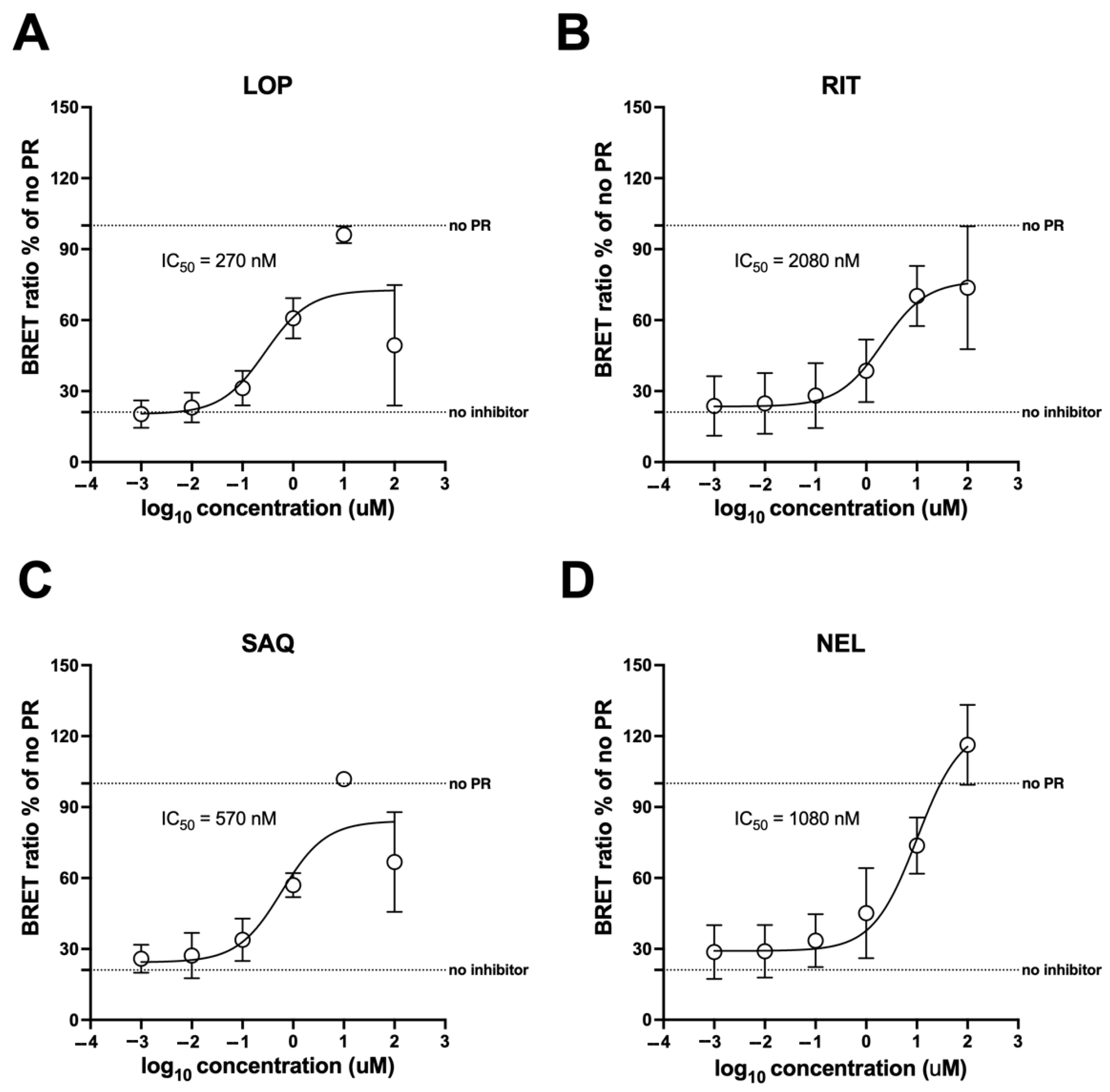 We investigated whether the mNG-p2/p7-NLuc reporter could serve as a tool for quantifying IC50 values of HIV-1 protease inhibitors in living cells. To this end, HEK293T cells were transfected with a plasmid expressing mNG-p2/p7-NLuc in the presence or absence of plasmid encoding for HIV-1 PR. Six hours p.t., media was replaced with DMEM containing either DMSO only or increasing concentrations of HIV-1 PR inhibitors RIT, LOP, SAQ, and NEF (range 0.001–100 µM). The effect of inhibitors on cell viability was investigated using mNG fluorescence (mNG Net) as a surrogate and confirmed that all compounds affected cell viability at 100 µM (Supplementary Figure S4). A dose-dependent restoration of the BRET ratio was observed, indicating progressive inhibition of HIV-1 PR activity by the tested compounds (Supplementary Figure S4). Data fitting allowed estimation of the IC50 for each inhibitor in living HEK293T cells (Figure 7). Under such settings, LOP was the most potent PR inhibitor (Figure 7A; IC50 = 270 nM), followed by SAQ (Figure 7C; IC50 = 570 nM), NEL (Figure 7D; IC50 = 1080 nM), and RIT (Figure 7B; IC50 = 1800 nM). Therefore, these results show that the mNG-p2/p7-NLuc reporter is a reliable tool for quantifying the potency of HIV-1 PR inhibitors in living cells.