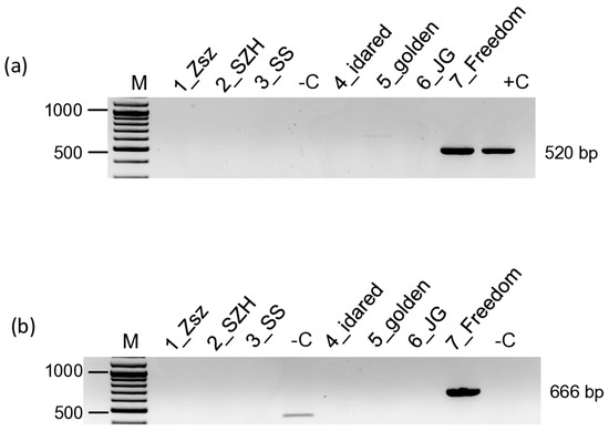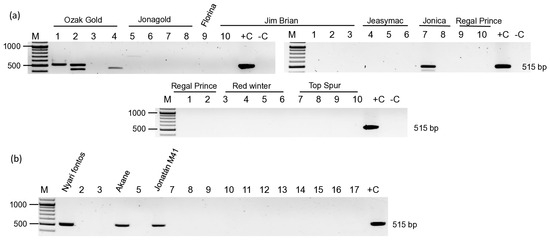 RT-PCR-based test to detect the ARWV2 Sa segment in the samples collected in 2019 at Erd in the (a) Old, certified stock collection, and (b) Old cultivar collection. M is the 100 bp+ GeneRuler of Thermo Scientific. +C is the positive, while –C is the negative control. Cultivar names of the positive samples are indicated above the photo. The negative cultivars on panel B are 2/Téli arany parmen, 3/Fertődi téli, 5/Starking Nm. 251, 7/Jonagold (12/5Ny), 8/Mutsu, 9/Idared, 10/Gloster, 11/Freedom, 12/Elstar, 13/Florina, 14/Charden, 15/Jerseymac, 16/Red Elstar, and 17/Regal Prince.