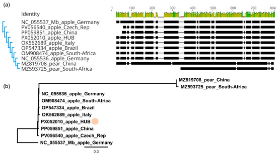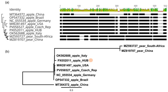 The sequence of the M segment of the Hungarian variant, encoding the MP, showed the closest similarity (99,2%) to the variant sequenced in an apple in China (PP059851). Similarly to the L segment, sequences of the Ma segment in the investigated range contained indels, which were characteristic of the host species (Figure 6a) and ARWV2 variants sequenced from pear clustered separately (Figure 6b).