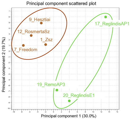 Principal component analysis of the sRNA reads sequenced in four ARWV2-infected: 1_Zsz, 7_Freedom, 9_Hesztiai, and 12_RosmertaSz (highlighted by brown colour), and in three ARWV2 non-infected: 17_ReglindisAP1, 19_RemoAP3, and 20_ReglindisE1 libraries (highlighted by green colour).