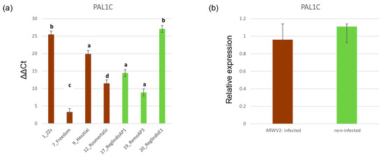 Bar graphs, representing the PAL1C gene expression of the ARWV2-infected and non-infected trees. (a) ΔΔCt values using qRT-PCR, detecting M. domestica expression using actin and ubiquitin as controls, was used to calculate (b) relative expression of PAL1C in the ARWV2-infected and non-infected trees. For individual trees, three technical replicates were used. Data are presented as the mean ± SD (n = 3). Statistical analysis was performed via one-way ANOVA. Post hoc analysis was performed using Tukey’s test and is marked using a compact letter display (CLD). The samples labelled with the same letter were not significantly different (significance level 0.05) from each other.