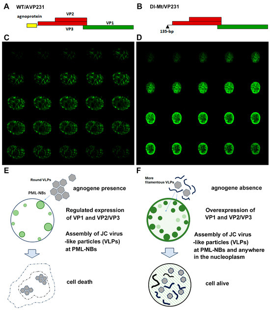 Next, a eukaryotic expression system was utilized to investigate agnogene functions in the context of the PML-NBs [7,9]. Figure 2A,B schematically illustrate the expression of the constructs WT/AVP231 and Dl-Mt/VP231, in which a polycistronic viral genomic fragment is inserted into a cDNA expression vector: WT/AVP231 encodes the complete agnogene and the capsid proteins VP1, VP2, and VP3, while Dl-Mt/VP231 lacks a 135 bp segment from the 5′ end of the agnogene. Our previous studies demonstrated that transfection with WT/AVP231 resulted in translational repression of viral proteins, and VP1 exhibited distinct punctate localization beneath the nuclear envelope, consistent with targeting PML-NBs. In contrast, Dl-Mt/VP231 transfection resulted in elevated VP1 expression and diffuse intranuclear distribution, with minimal accumulation to PML-NBs [8]. The intranuclear localization of JCV VP1 in cells transfected with WT/AVP231 or Dl-Mt/VP231 is presented in Figure 2C,D, respectively. It was repeatedly shown that in the presence of the agnogene and/or its product, the expression level of VP1 was reduced, yet it restrictively localized to PML-NBs [8,9].
