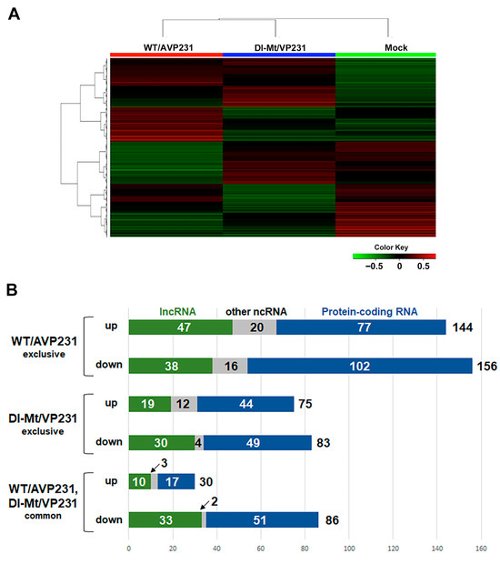 A heatmap of differentially expressed RNAs in transfected cells. (A) A heatmap showing the top 12,000 differentially expressed genes in cells transfected with WT/AVP231 or Dl-Mt/VP231, compared to mock-transfected controls. Expression patterns were distinct between the agnogene-positive and agnogene-negative conditions. (B) A bar graph summarizing the number of upregulated and downregulated transcripts (with a change greater than 2 folds) for each condition. WT/AVP231 induced more changes than Dl-Mt/VP231, with both conditions sharing some differentially expressed genes.