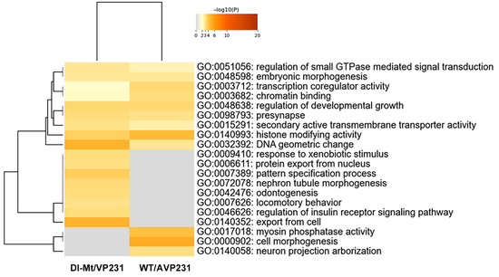 Expression of protein-coding RNA was examined in more detail, and the numbers of differentially expressed nuclear proteins and non-nuclear proteins in WT/AVP231 (247 genes) and Dl-Mt/VP231 (161 genes) are summarized in Supplementary Dataset S2A. Gene Ontology (GO) analysis of protein-coding RNA was conducted using Metascape software. The data is presented in Figure 4, which shows that the top 20 enriched GO terms in both groups included transcription coregulator activity (GO:0003712), chromatin binding (GO:0003682), histone-modifying activity (GO:0140993), and DNA geometric change (GO:00032392). These terms highlight nuclear regulatory processes, suggesting that JCV infection affects transcription-related nuclear events irrespectively of agnogene presence.