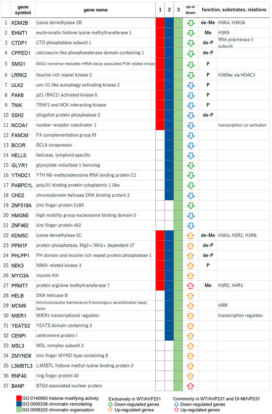 Chromatin organization genes in WT/AVP231-transfected cells. Differentially expressed genes in WT/AVP231-transfected cells included the 37 chromatin organization genes (GO:0006325, green), which contained 17 genes with histone-modifying activity (GO:0140993, red). These included kinases (e.g., SMG1, LRRK2), phosphatases (e.g., CTDP1), methyltransferases (EHMT1, PRMT7), and demethylases (KDM2B, KDM5C). The agnogene appeared to regulate a wide spectrum of chromatin-associated enzymes.