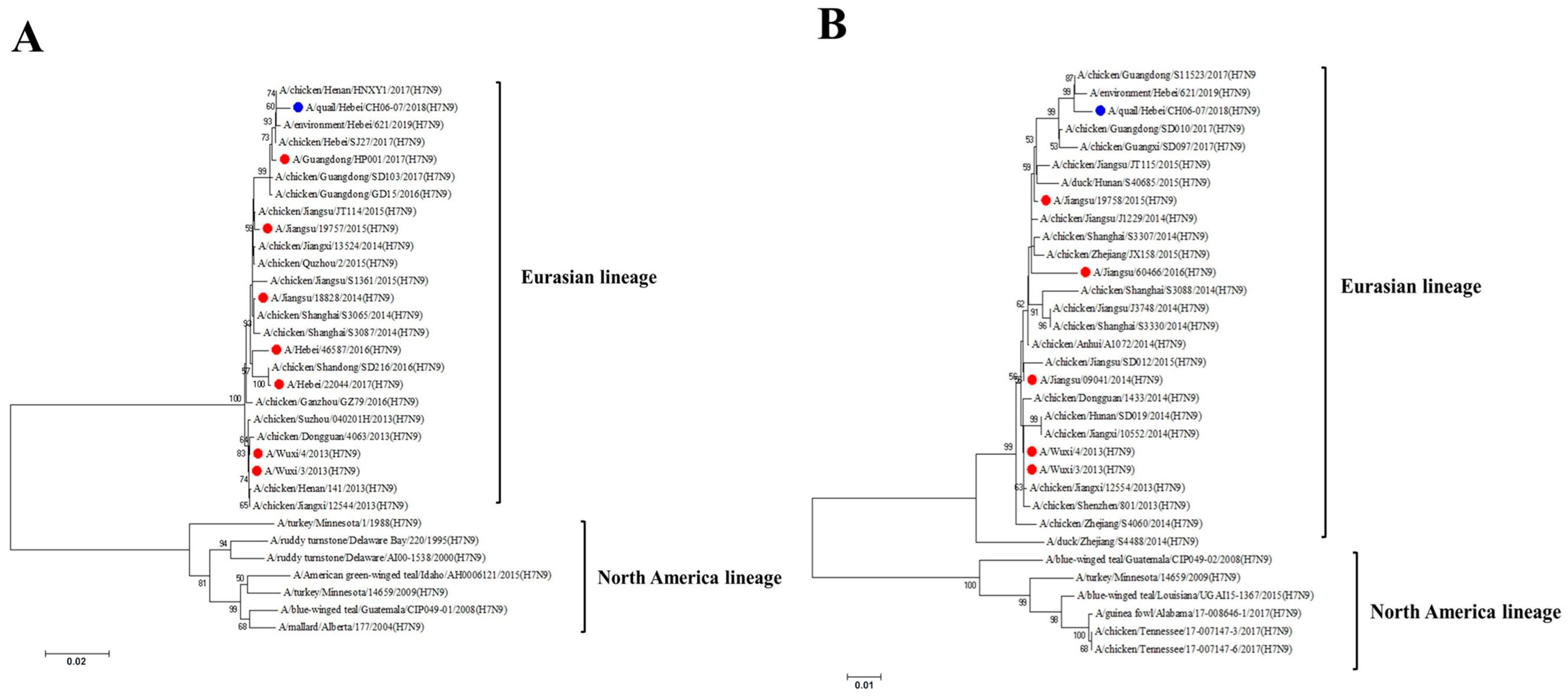3.1. Phylogenetic Analysis of the Surface Genes of the Quail-Origin H7N9 Virus CH06-07
