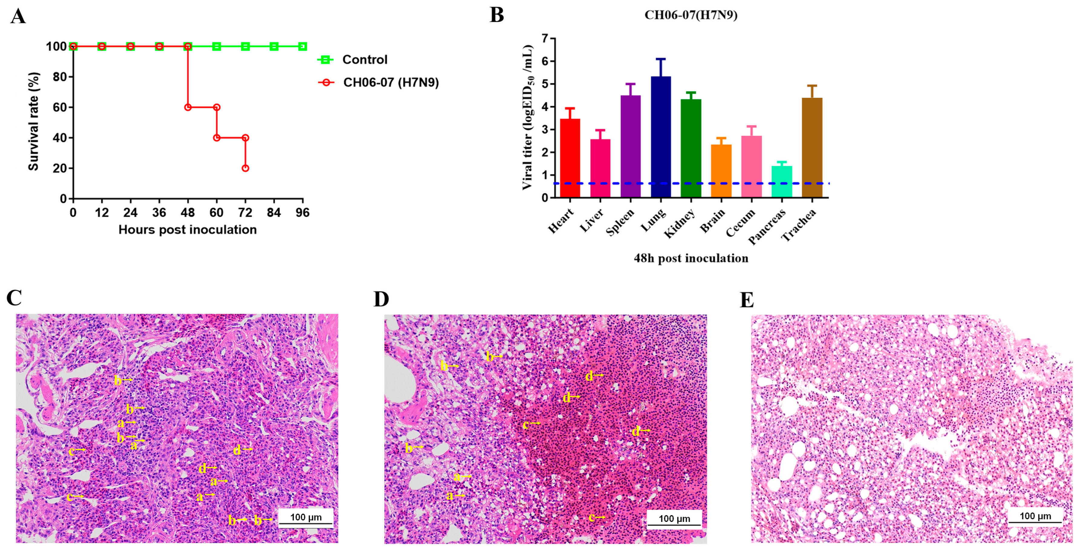 3.3. The Quail-Origin H7N9 Virus Ch06-07 Exhibited High Pathogenicity in Quails