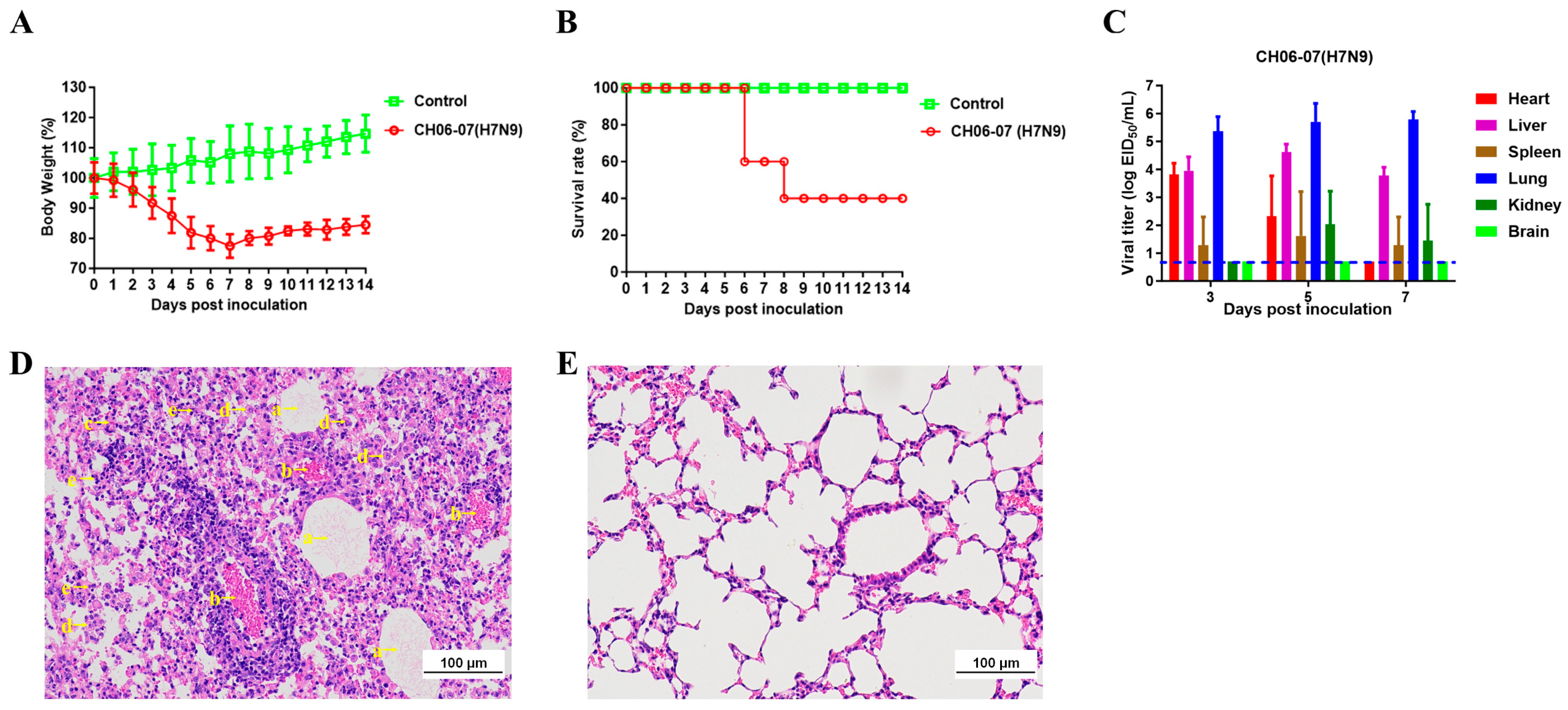 3.4. The Quail-Origin H7N9 Virus Ch06-07 Exhibited High Pathogenicity in Mice