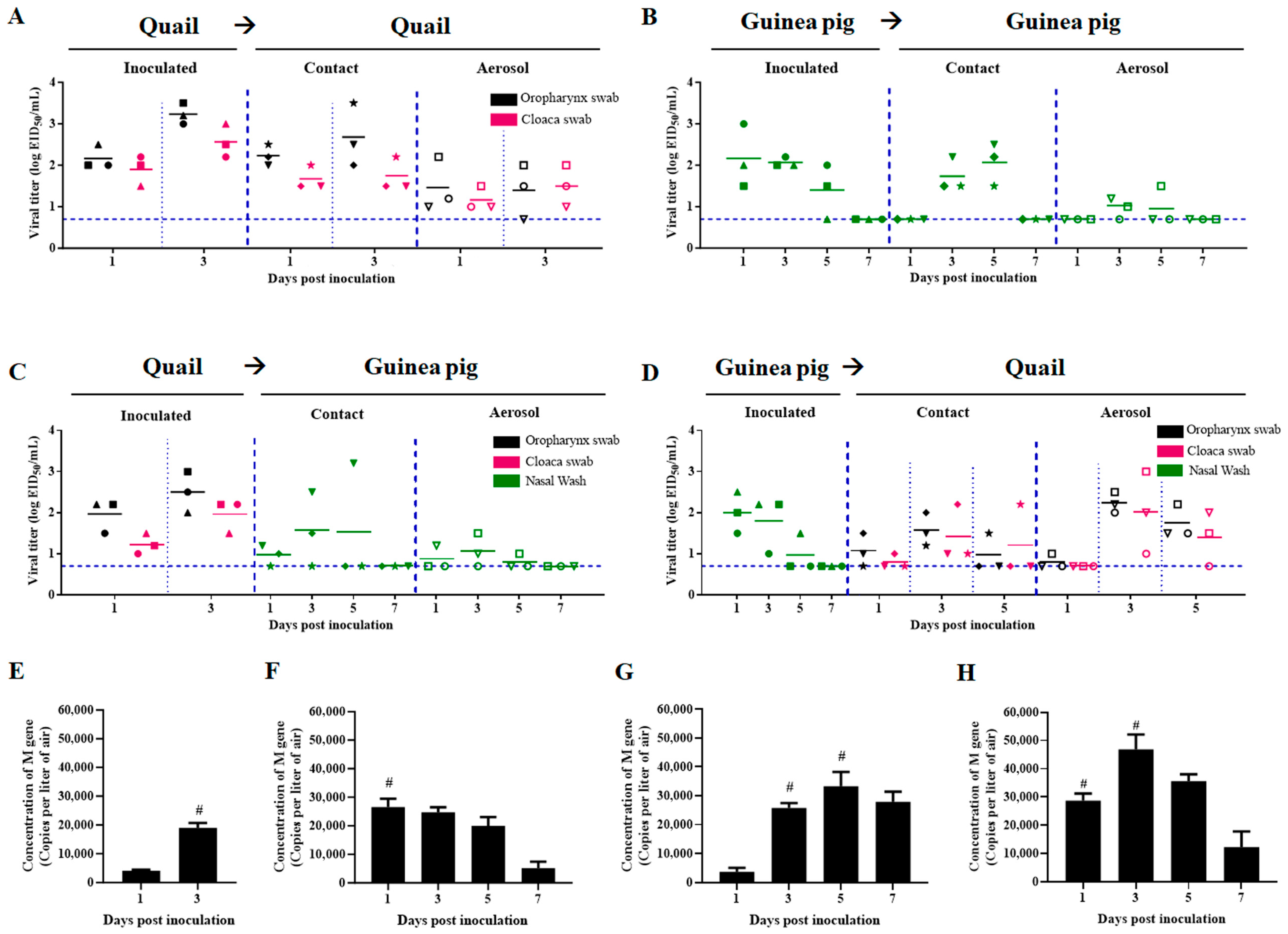 3.5. The Quail-Origin H7N9 Virus Demonstrated Cross-Species Transmission Between Quail and Guinea Pigs, and Infectious Viral Particles Were Successfully Recovered from Environmental Aerosols