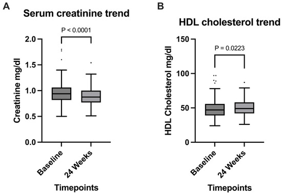 Figure 2A); HDL cholesterol levels showed a significant increase from a median of 47 mg/dL (39–56) at baseline to 49 mg/dL (42–58) at 24 weeks (