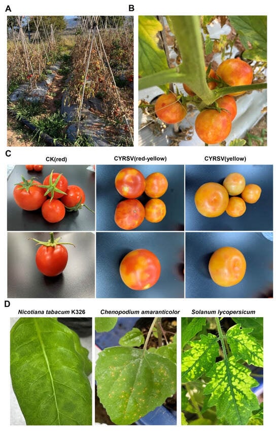 Color loss symptoms. (A) Field symptoms of CYRSV. (B) Tomatoes showing color changes. (C) Tomatoes showing lesions of different colors. (D) Yellow ringspot lesions appeared in Nicotiana tabacum K326, necrotic spot lesions appeared in Chenopodium amaranti, and wrinkled, necrotic spot lesions appeared in Solanum lycopersicum after inoculation with extracts from tomatoes with color lesions.