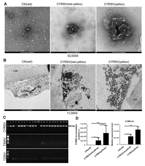 Identification of CYRSV in tomato fruits with colored lesions. (A) Viral particles present in fruit extracts from tomatoes with colored lesions were detected via negative staining and electron microscopy. Scale bar = 500 nm. (B) Ultrathin sections and electron micrographs showing viral particles present in the cytoplasm of pulp cells of tomatoes with colored lesions. V, virus; CW, cell wall; CH, chloroplast. Scale bar = 500 nm. (C) Results of electrophoretic analysis of tomato samples using specific primer PCR. Lane 1–20 indicate tomatoes with colored lesions. Healthy tomatoes were used as the NC. (D) CYRSV accumulation in tomato fruits in different groups was determined via absolute and relative RT–qPCR. The data are presented as the mean ± SD (n = 5), and one-way ANOVA was used to determine the significant differences among the three groups. Asterisk indicate significant differences: * p < 0.05, *** p < 0.001.