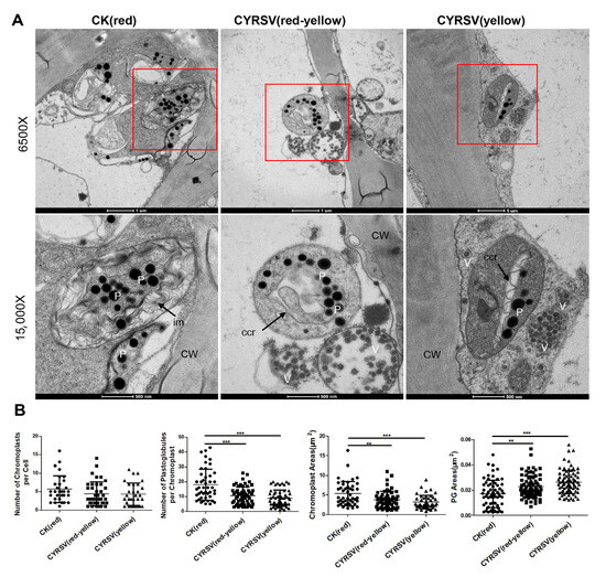Transmission electron micrographs of chromoplasts present in tomato fruits with different-colored lesions. (A) Chromoplast micrographs of the CK (red), CYRSV (red-yellow), and CYRSV (yellow) groups. The lower image is a magnification of the red box in the upper image. P, plastoglobule; ccr, carotenoid crystalloid; CW, cell wall; V, virus; im, inner membrane. Scale bar = 1 μm or 500 nm. (B) Number and areas of chromoplasts and plastoglobules in tomato fruits in the CK (red), CYRSV (red-yellow), and CYRSV (yellow) groups. Asterisk indicate significant differences: ** p < 0.01, *** p < 0.001.