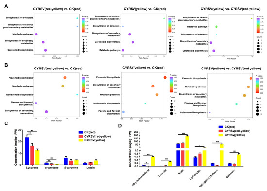 Analysis and concentrations of carotenoid and flavonoid metabolites in the fruits of different groups of tomatoes. (A) Kyoto Encyclopedia of Genes and Genomes (KEGG) enrichment map of carotenoid metabolites in three comparison groups: CYRSV (red-yellow) vs. CK (red), CYRSV (yellow) vs. CK (red), and CYRSV (yellow) vs. CYRSV (red-yellow). A higher enrichment factor indicates a greater degree of enrichment. (B) Differentially abundant metabolite enrichment pathways for flavonoids in three comparison groups: CYRSV (red-yellow) vs. CK (red), CYRSV (yellow) vs. CK (red), and CYRSV (yellow) vs. CYRSV (red-yellow). The color and size of the points represent the range of the p value and the number of differentially abundant metabolites enriched, respectively. A more intense red color indicates more significant enrichment. (C) Lycopene, α-carotene, β-carotene, and lutein contents of two colors of lesion and normal (CK) fruits were quantified. (D) Dihydrokaempferol, luteolin, rutin, (-)-catechin, naringenin chalcone, and quercetin contents of two colors of lesion and normal (CK) fruits were quantified. FW, fresh weight. Asterisk indicate significant differences: * p < 0.05, ** p < 0.01, *** p < 0.001.
