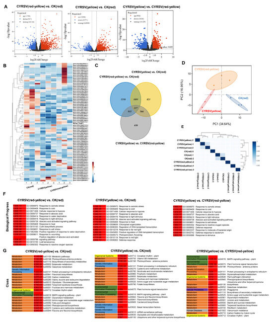 Transcriptome analysis. (A) Number of differentially expressed genes (DEGs) in CYRSV (red-yellow) vs. CK (red), CYRSV (yellow) vs. CK (red), and CYRSV (yellow) vs. CYRSV (red-yellow). (B) Clustering heatmap of carotenoid metabolites in the three comparisons. (C) Venn analysis results of different comparisons. (D) PCA distribution. (E) Sample correlation heatmap. (F) Biological process terms among the top 20 enriched GO terms for all the DEGs. (G) The top 20 enriched KEGG pathways for all the DEGs. Red indicates the p value, and the other colors indicate different classes of KEGG pathway.