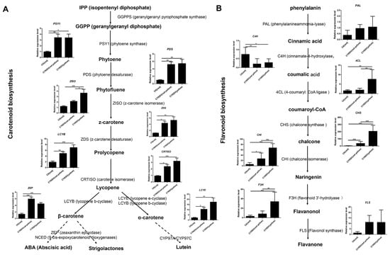 As shown in Table 1, the significant DEGs (GGPS, NCED, CHS, CHI, FLS, and F3H) enriched in the carotenoid biosynthesis and flavonoid biosynthesis pathways were significantly upregulated in CYRSV (red-yellow) vs. CK (red); the DEGs (GGPS, PSY1, ZDS, LCYB, NCED, CHI, FLS, and F3H) enriched in the carotenoid biosynthesis and flavonoid biosynthesis pathways were significantly upregulated in CYRSV (yellow) vs. CK (red); and the DEGs (FLS and F3H) enriched in the flavonoid biosynthesis pathway were significantly downregulated in CYRSV (yellow) vs. CYRSV (red-yellow). However, other genes related to the carotenoid biosynthesis and flavonoid biosynthesis pathways were not significantly enriched. Hence, both carotenoid biosynthesis and flavonoid biosynthesis are important pathways, which prompted us to elucidate the mechanism underlying the induction of tomato fruit lesions due to CYRSV.