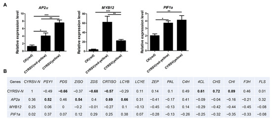 As shown in Table 2, the levels of MYB12 and PIF1 were greater in both CYRSV (red-yellow) and CYRSV (yellow) than in CK (red). However, compared with that in the CK (red) group, the expression of some members of the AP2/ERF family in the CYRSV (red-yellow) group increased, while that of some other members did not significantly differ (Table 2). The AP2/ERF family, the MYB family, and PIF1a are related to the regulation of carotenoid synthesis and flavonoid synthesis. On the basis of the results of the transcriptome analysis and the literature, the possible roles of transcription factors (AP2a, MYB12, and PIF1a) in regulating the production of carotenoids and flavonoids in CYRSV-infected tomatoes were analyzed via RT–qPCR. The transcription factors AP2a, MYB12, and PIF1a were highly significantly expressed in tomato fruits with colored lesions (Figure 7A). The observed gene expression patterns were subsequently compared with those of the carotenoid and flavonoid genes. Correlation analysis revealed that the expression of CYRSV-N was negatively correlated with the expression of carotenoid genes (PDS, ZDS, and CRTISO) and positively correlated with the expression of flavonoid genes (4CL, CHS, and CHI), suggesting that the carotenoid and flavonoid genes are potential colored-lesion regulators in CYRSV-infected tomato fruit. Moreover, the expression of AP2a was positively correlated with the expression of genes encoding the key enzyme of carotenoids (PSY1, ZISO, CRTISO, and LCYB), suggesting that AP2a is a potential regulator of carotenoid biosynthesis in tomato fruits (Figure 7B). Our findings suggest that CYRSV influences AP2a levels to activate genes encoding enzymes of the carotenoid pathway to regulate the production of carotenoids in tomato fruits, which leads to colored lesions in tomato fruits.