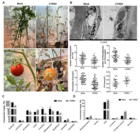 Effects of CYRSV infection on the color, chromoplasts, and carotenoid and flavonoid pathways in tomato fruits. (A) Tomato symptoms after CYRSV infection. (B) Chromoplast micrographs for the CYRSV and mock groups. Numbers and areas of chromoplasts and plastoglobules in the CYRSV and mock groups. P, plastoglobule; ccr, carotenoid crystalloid; CW, cell wall; V, virus; scale bar = 500 nm. Carotenoid (C) and flavonoid (D) metabolite contents in tomato fruits from the CYRSV and mock groups. Asterisk indicate significant differences: * p < 0.05, ** p < 0.01, *** p < 0.001.