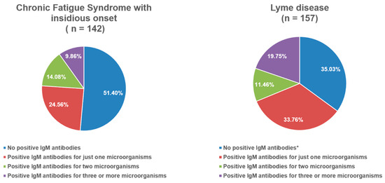 Frequency distribution of IgM-positive antibodies in chronic fatigue syndrome with insidious onset and Lyme disease. *—In Lyme disease group, positive IgM antibodies for Borrelia spp. (Elisa and Western blot) were not taken into account when calculating the overall sum of positive IgM antibodies because they were one of the inclusion criteria for that group.