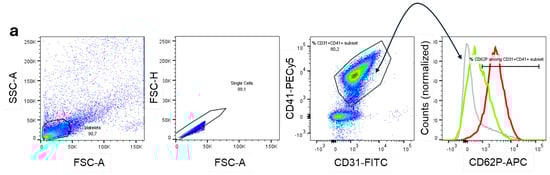 Previously stimulated platelets resuspended in 200 μL of blocking buffer and incubated for 30 min on ice. Then, platelets were centrifuged at 1000× g for 10 min at room temperature (RT), and a mixture of fluorochrome-conjugated monoclonal antibodies was added to the pellet: CD31-FITC (Cat. no. 9381-02, Biotech, Boston/Cambridge, MA, USA), CD41-PE-Cy5 (Cat. no. 303708, BioLegend, San Diego, CA, USA), and CD62P-APC (Cat. no. 304910, BioLegend), in addition to the cell viability dye LIVE/DEAD™ Fixable Green (Cat. no. L23101, Invitrogen; 1 μL) with incubation for 30 min at 4 °C, protected from light. Then, the samples were washed twice with wash buffer, centrifuging at 1000× g for 10 min at 4 °C. Finally, the platelet pellets, now perfectly prepared, were resuspended in 300 μL of PBS and immediately submitted to acquisition on a FACSymphony A5 flow cytometer from the Fiocruz Technological Platforms Network (PDTIS).